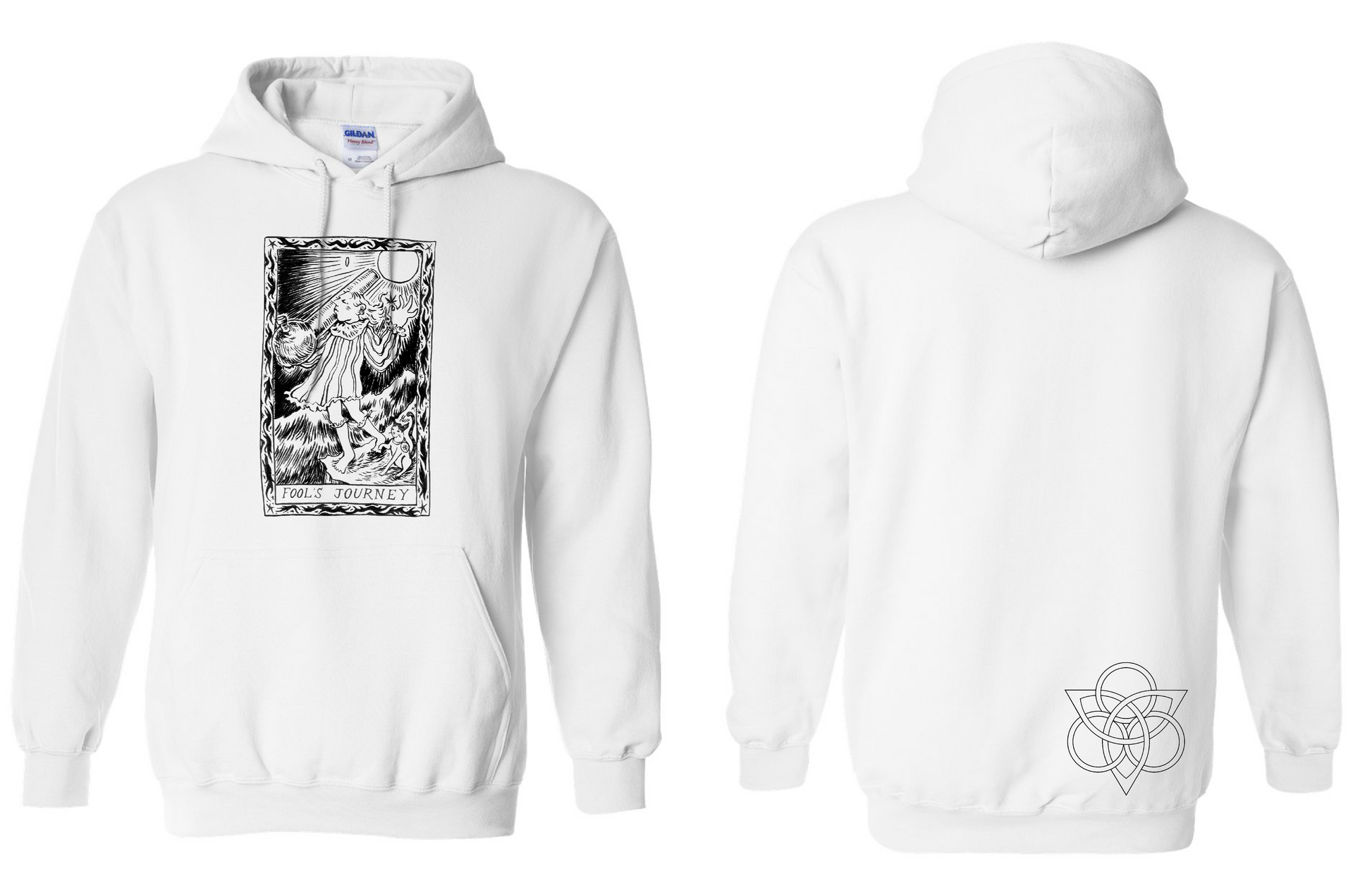 white hoodie featuring original artwork by Maya Greenberg (instagram @oldmaya)